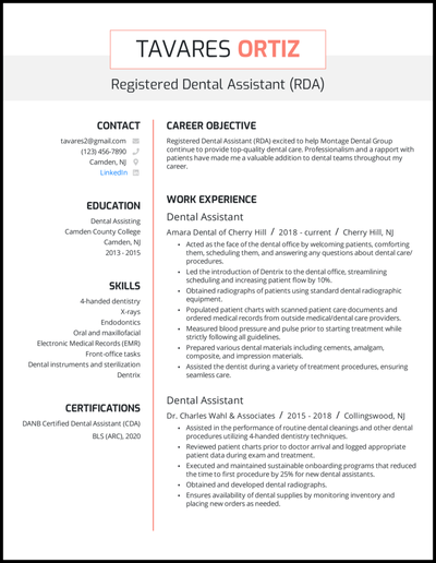Licensed Dental Assistant Resume August 2021 from resumecompanion.com You may have already done some research on what to include in your resume. Social dental assistant with over two years of practical experience in an academic and clinical setting. Sample dental assistant resume objectives. Notice that every skill is not listed. Land more interviews faster with our writing tips. These 5 dental assistant resume samples have all helped real dental assistants land real jobs, so they're a great place to start. Consider the addition of a resume objective. Their duties include delivering oral healthcare services, sterilizing instruments and equipment, offering oral care advice, ensuring emotional support, and updating records.